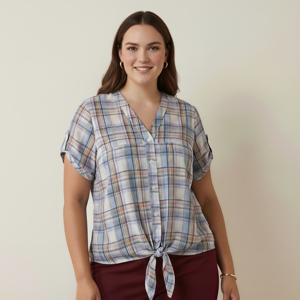 O xadrez colorido nas cores laranja, azul e verde, aliado ao detalhe de amarração na frente, adiciona um toque de modernidade e charme à peça, enquanto a manga curta oferece leveza e versatilidade. Pode ser combinada facilmente com calças, saias ou shorts, permitindo produções que vão do casual descontraído ao social refinado.