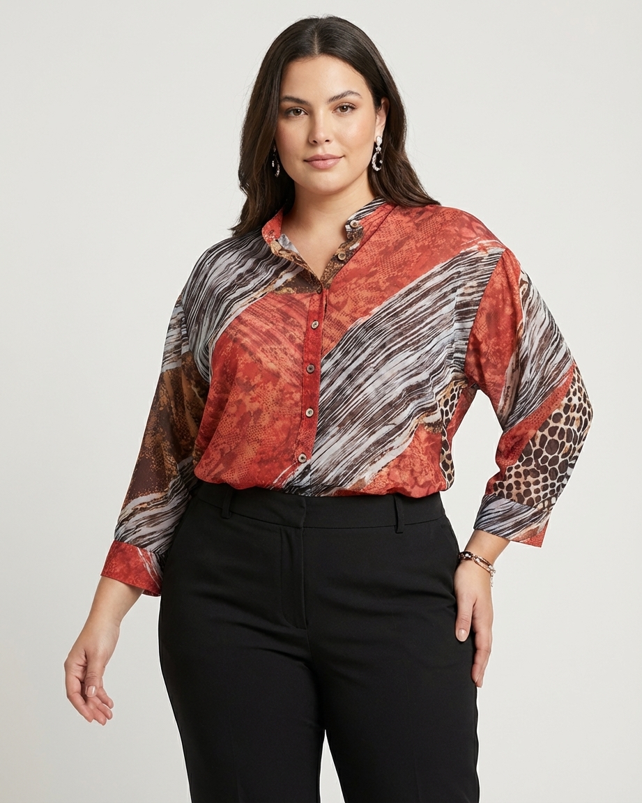 O estampado com fundo vermelho e listras pretas garante um visual moderno e impactante, perfeito para produções elegantes e cheias de personalidade. A gola padre adiciona um toque refinado ao design, enquanto as mangas 7/8 trazem praticidade e versatilidade, permitindo o uso em diversas ocasiões – desde looks de trabalho até combinações casuais mais sofisticadas.