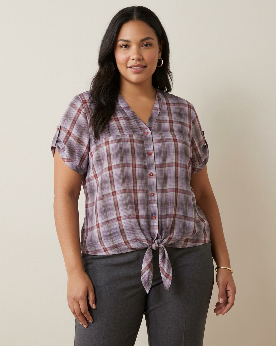 O xadrez nas cores roxo e vermelho, combinado com o detalhe de amarração na frente, adiciona um toque de sofisticação e charme, enquanto a manga curta oferece leveza e versatilidade. A camisa pode ser facilmente combinada com calças, saias ou shorts, permitindo produções que vão do casual descontraído ao social refinado.